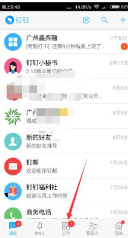 2、注冊一個自己的賬號,然后加入你所在公司的群組。點擊下方工具欄中的“工作”