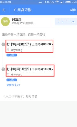 3、點擊考勤打卡就可以打卡了,還會顯示打卡的時間,還有多久遲到